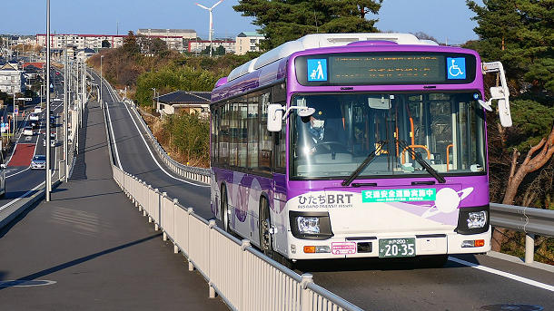 専用道を走行する「ひたちBRT」の大型ハイブリッドバス日立市が渋滞緩