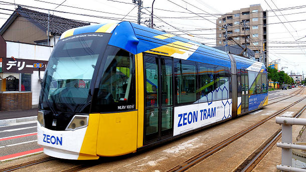 万葉線の志貴野中学校前駅を発車したMLRV1001越ノ潟行き