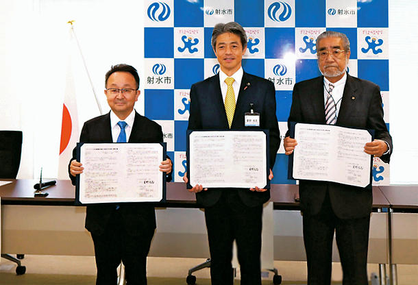 協定書を手にする(左から)青木社長、夏野市長、加治組合長=射水市役所