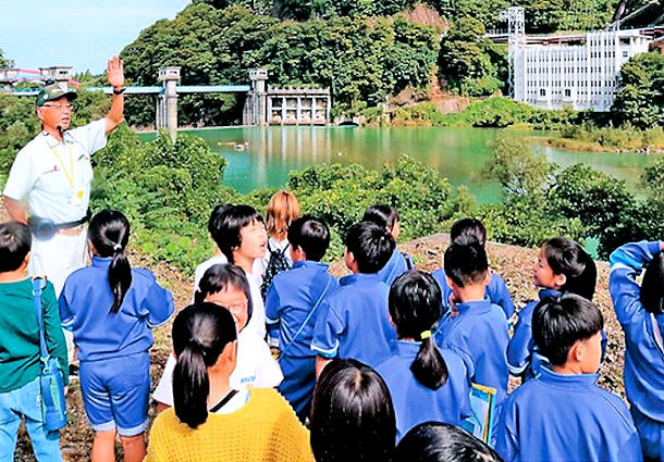 黒東合口用水の取水口や発電所を見学する児童=愛本堰堤