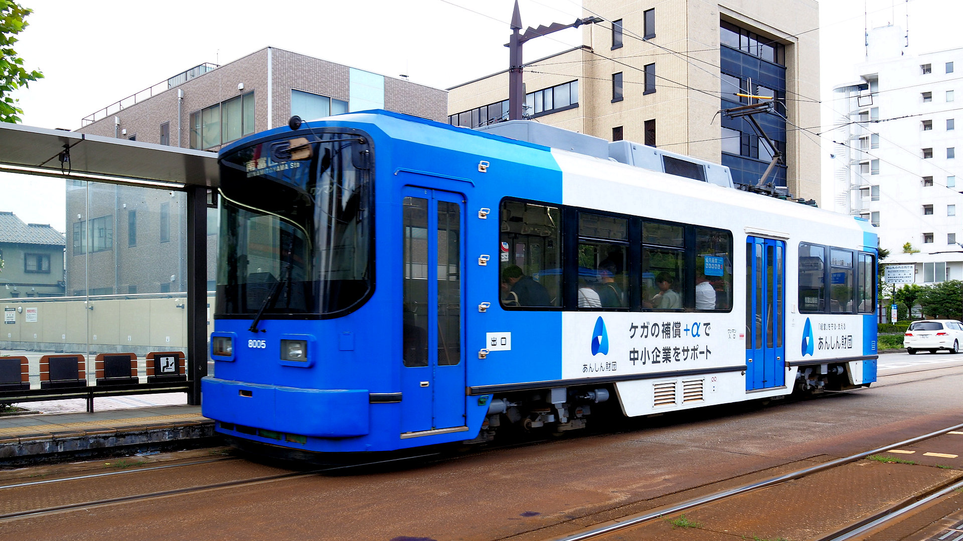 富山地方鉄道富山市内軌道線丸の内駅を発車した8005南富山駅前行き