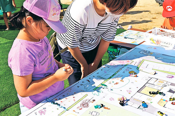 建設予定の施設の未来を想像しながら、平面図に絵を描く参加者