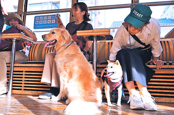 貸し切りの市内電車を犬と楽しむ参加者=桜橋通り
