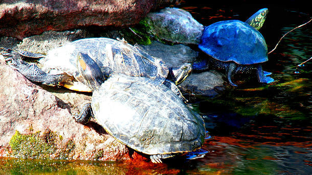 亀の池のミシシッピアカミミガメとクサガメ 首の模様や甲羅が異なる