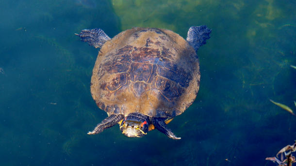 餌がもらえるかと泳いでくるミシシッピアカミミガメ