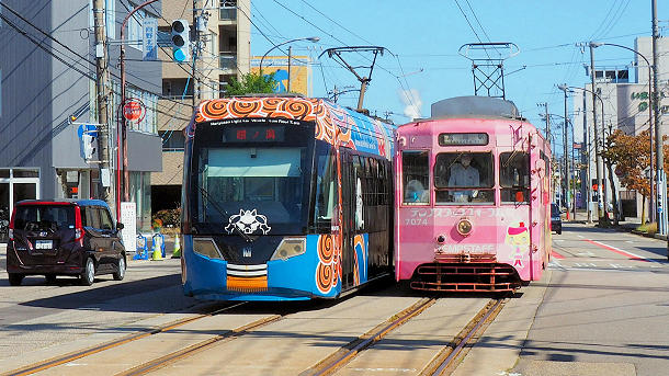志貴野中学校前駅付近で行き違う1005越ノ潟行きと7074高岡駅行き