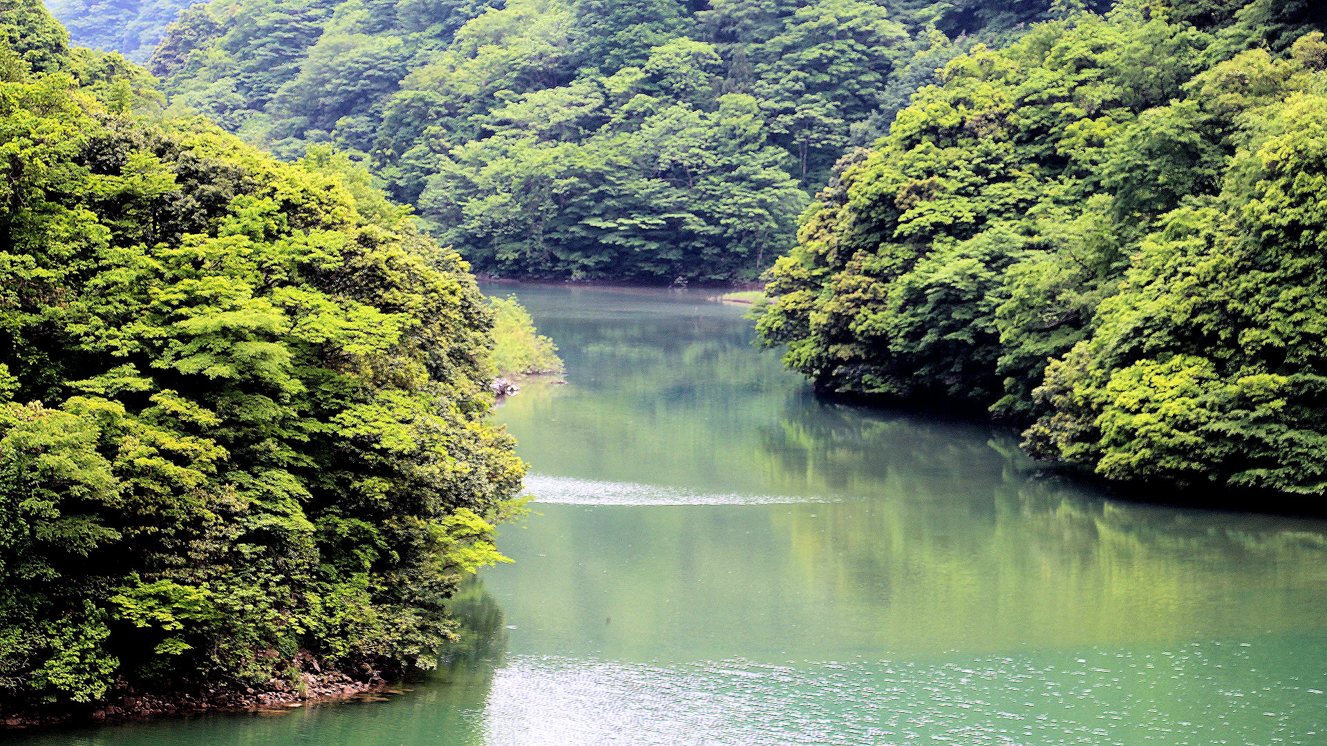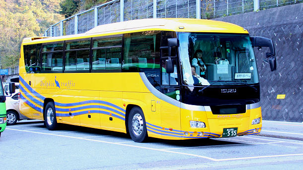 イルカ交通の観光バス 砺波市庄川町小牧の大牧温泉定期船のりば