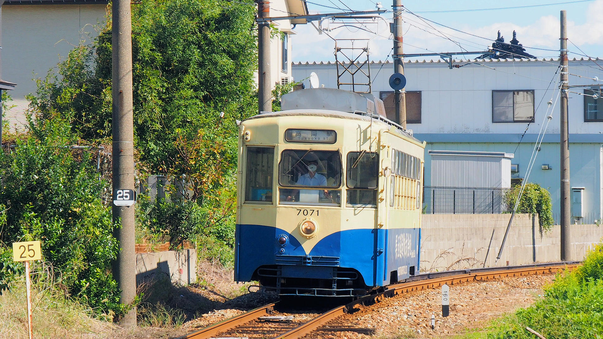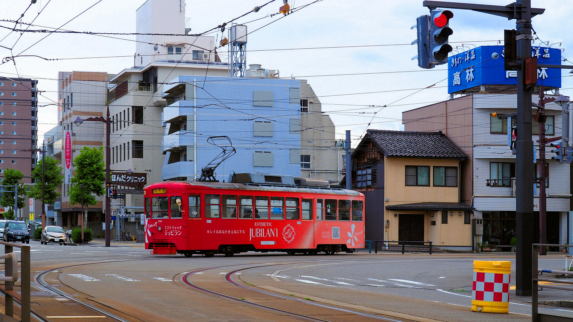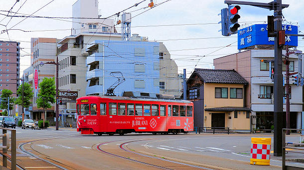 富山地方鉄道富山市内軌道線丸の内駅を発車した7019富山大学前行き