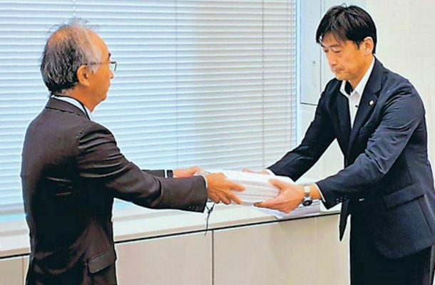 富山県分の反対署名を平野部長(右)に手渡す田子代表理事会長=岐阜県庁