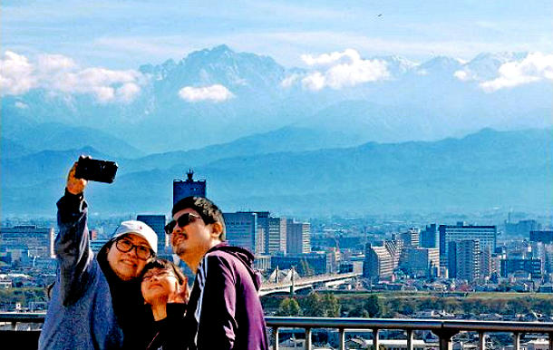 「海越しの立山連峰と高校生を描いたボードで、若者が地元を愛しているこ