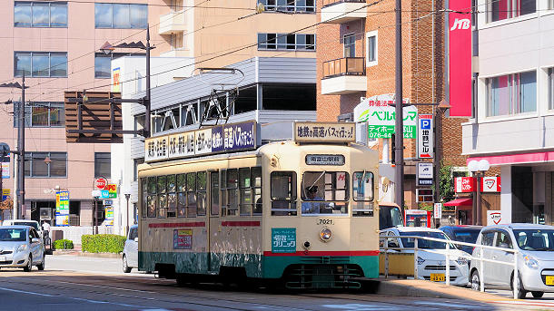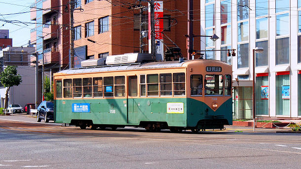 富山市内軌道線丸の内駅に到着する7018南富山駅前行き