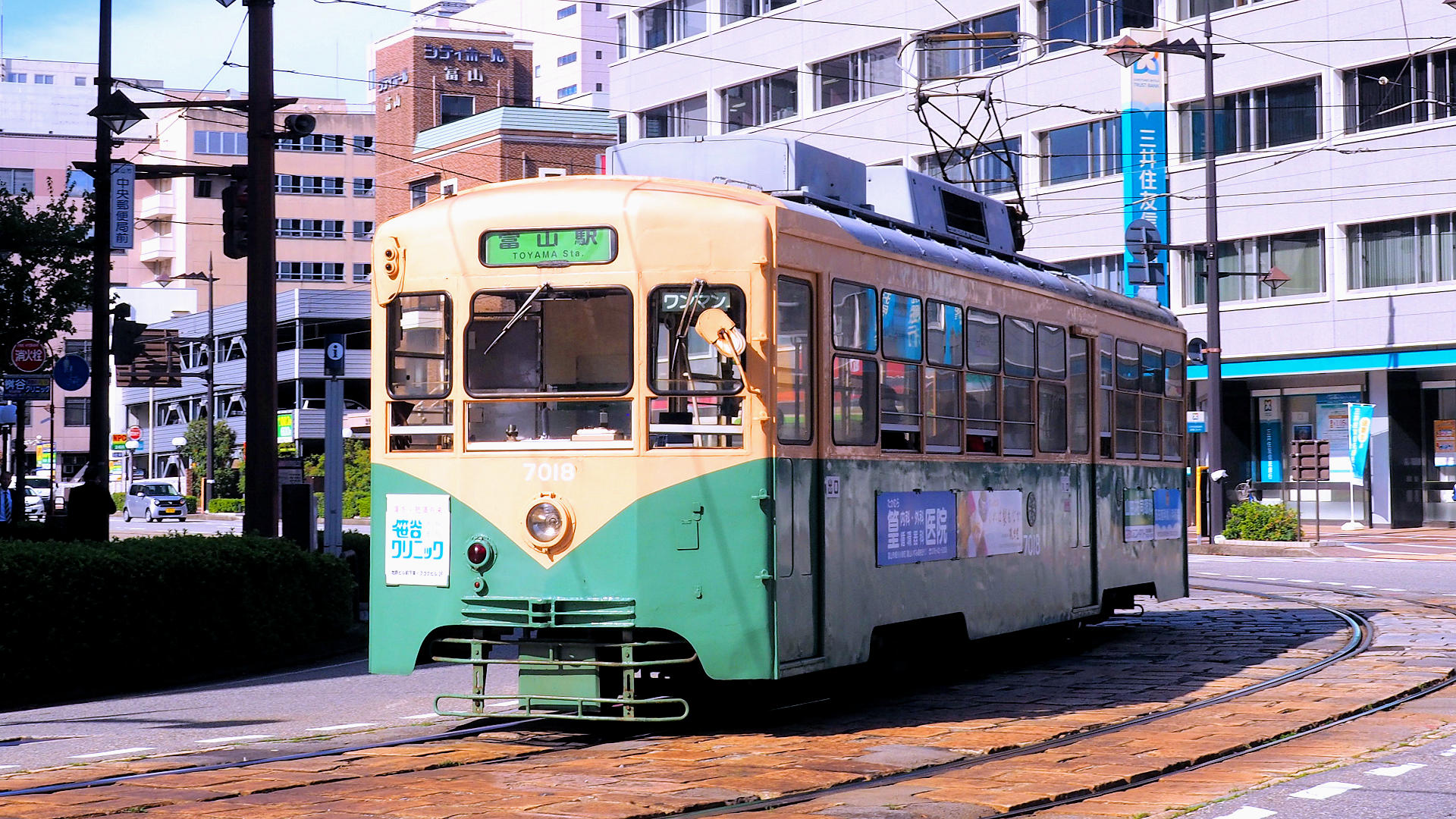 地鉄ビル前駅を発車した7018富山駅行き 2019/10/23 撮影