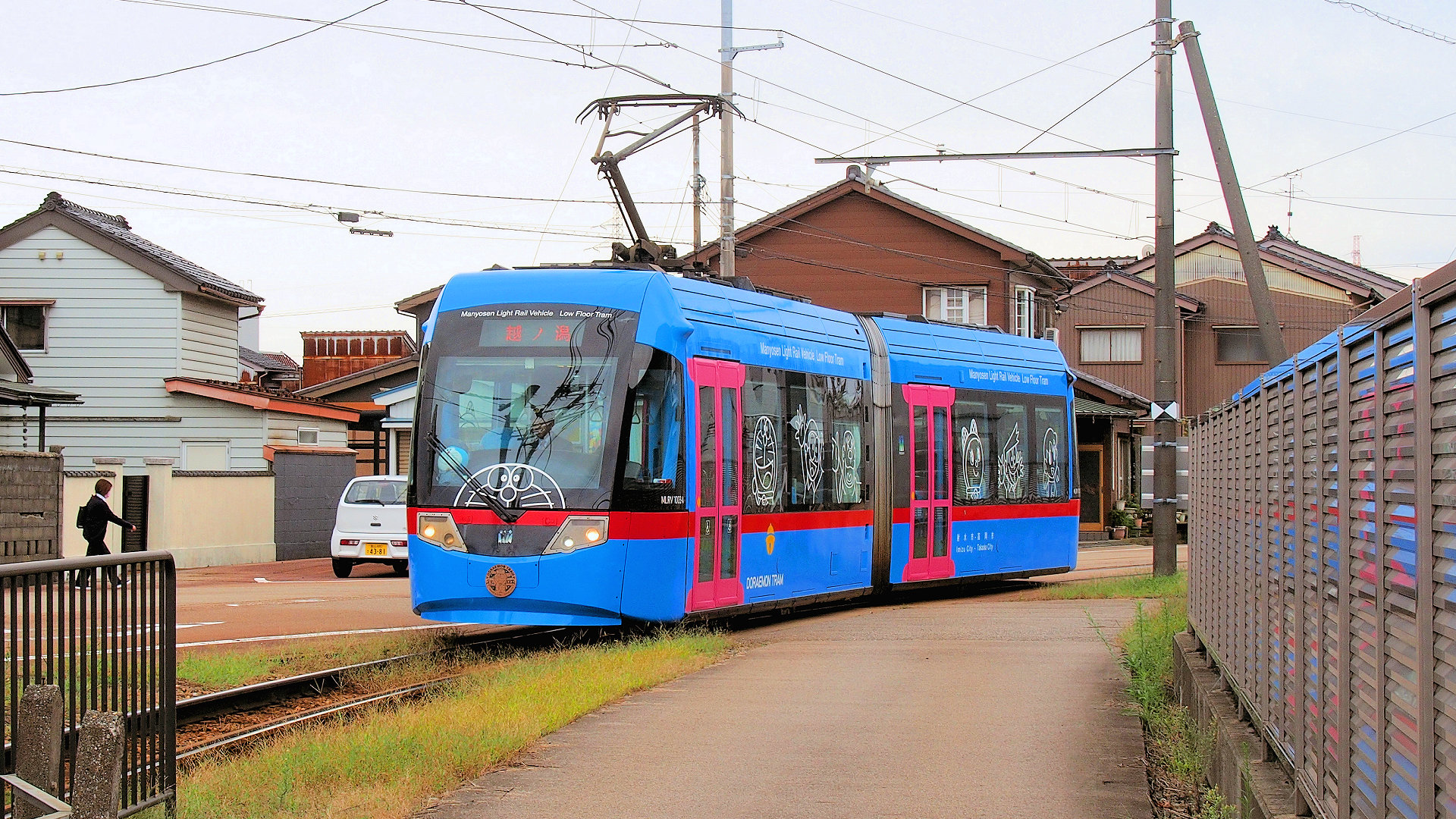 射水市庄西町2丁目の万葉線 高岡軌道線の射水市、高岡市境界を走る