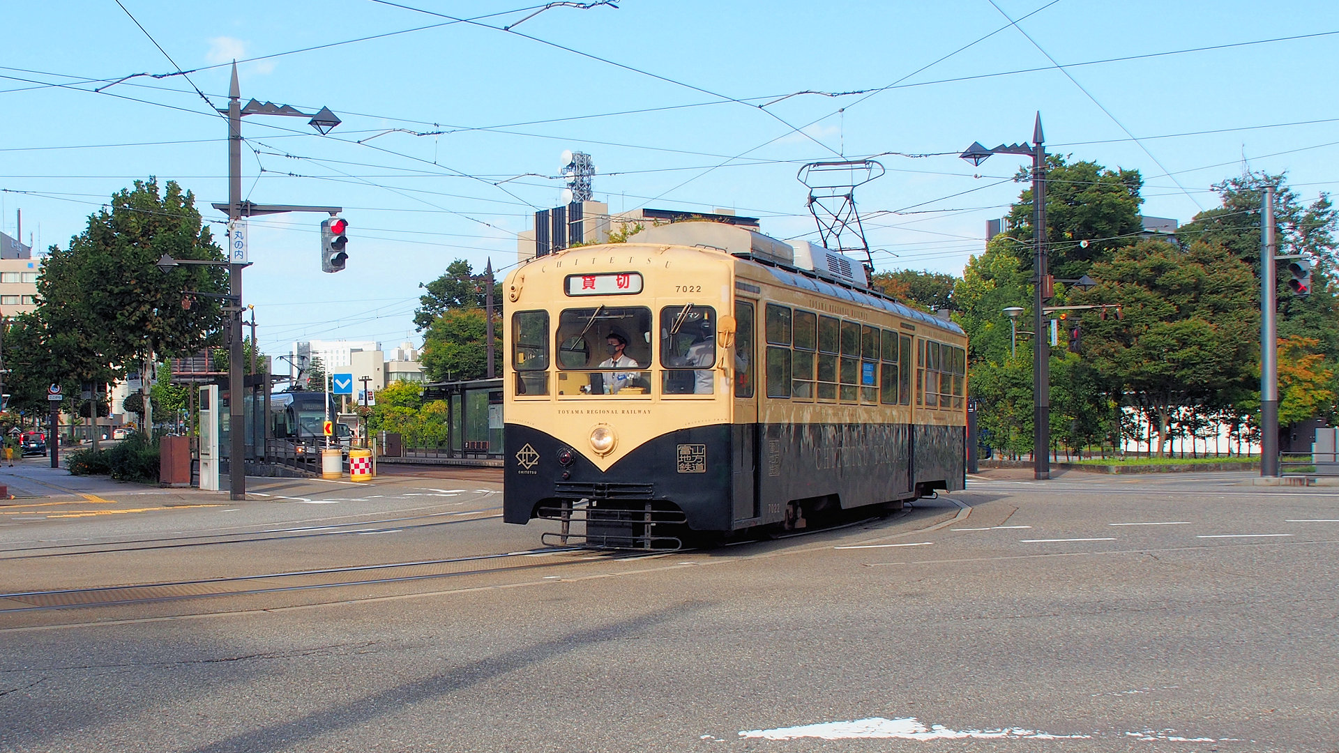 富山地方鉄道富山市内軌道線丸の内駅を発車した7022貸切富山大学前行き