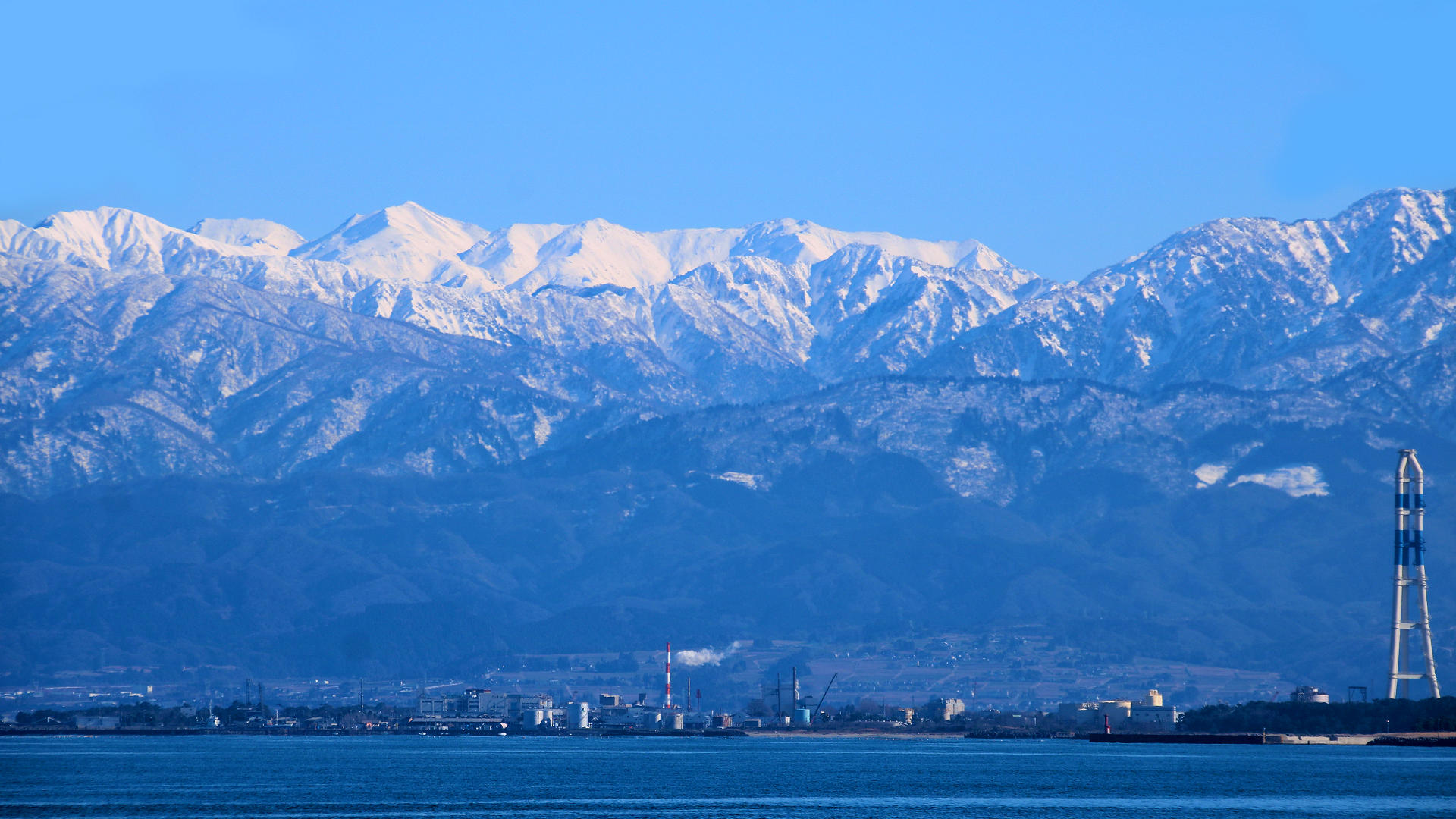 海老江海浜公園から白馬連峰煙突は北陸電力富山火力発電所