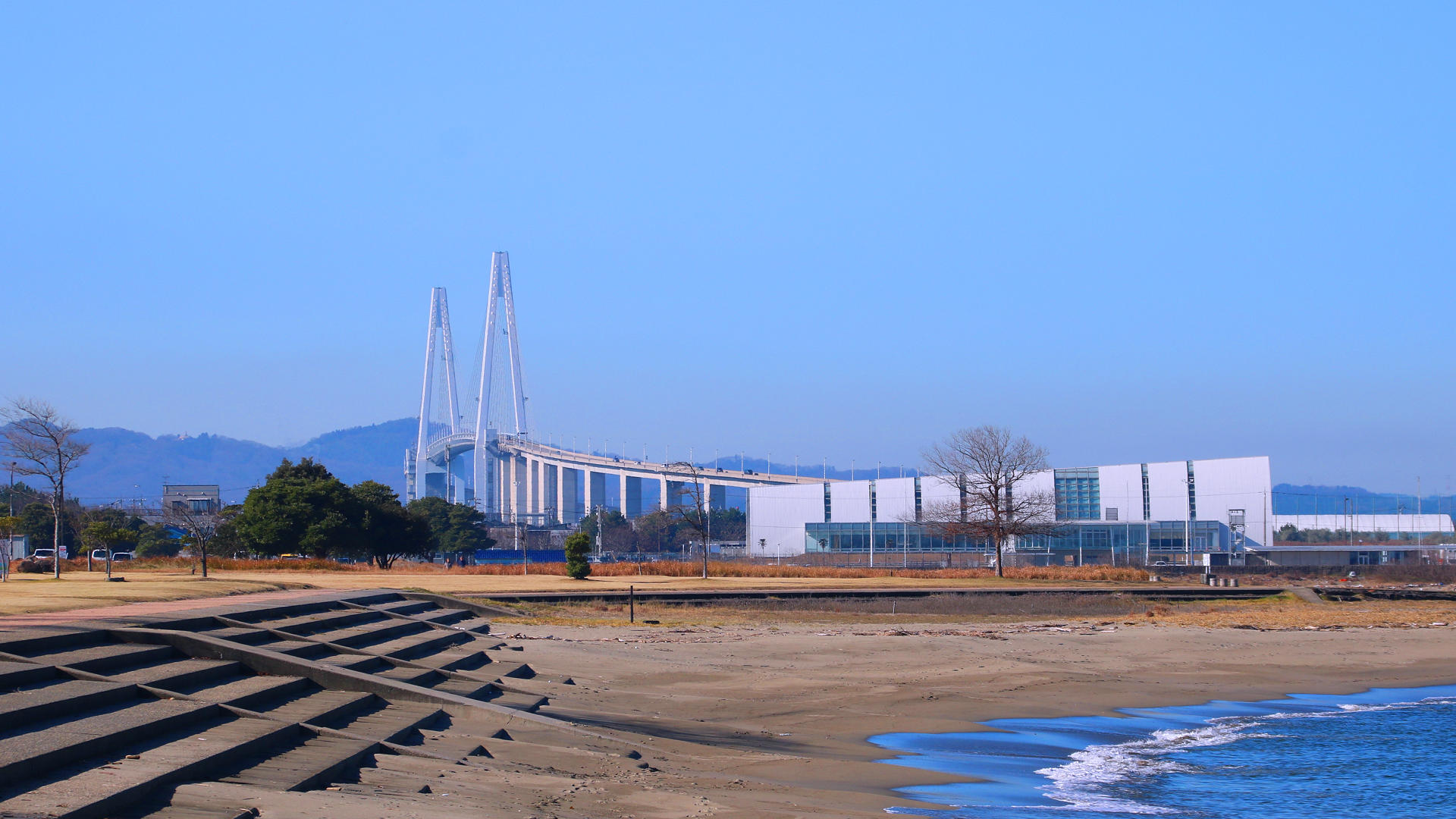 射水市の海老江海浜公園から新湊大橋と海竜スポーツランド