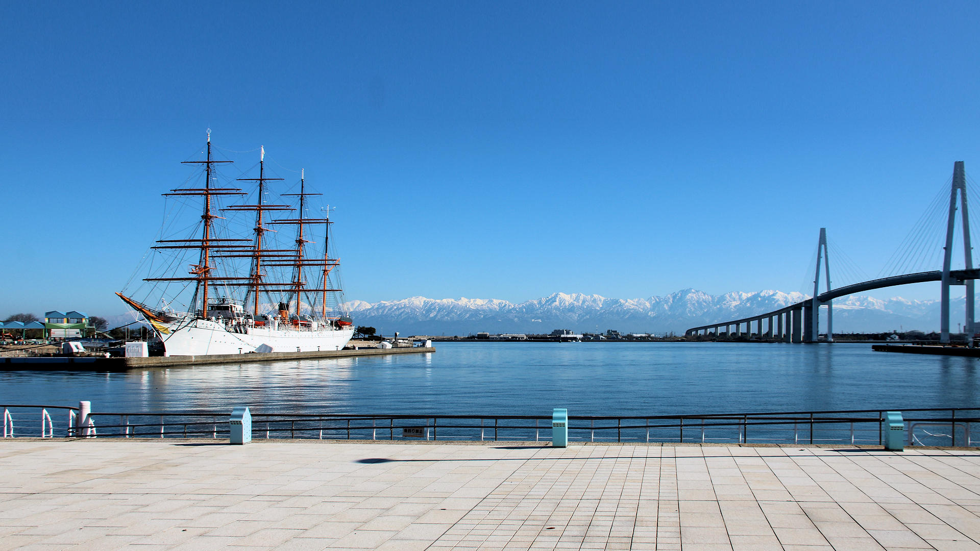 海王丸パークから帆船海王丸、立山連峰 、新湊大橋 2025/12/19 撮影
