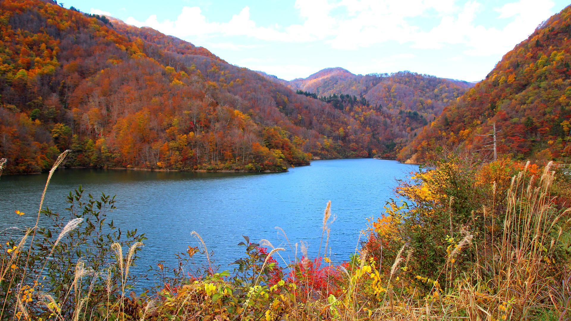 南砺市西赤尾町の境川ダムの半島部から左岸道路から上流側