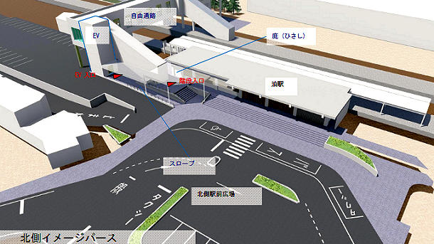 ![]() 泊駅バリアフリー化北口イメージパース図 画像:朝日町から |