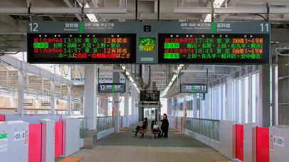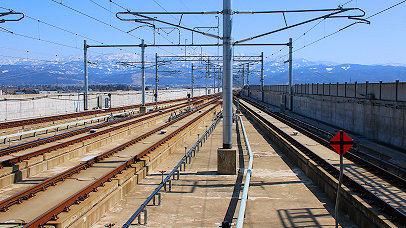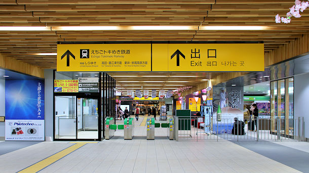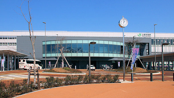 上越妙高駅は1918年(大正7)年11月1日に信越本線の脇野田信 号場として開設され、1921年(大正10)年8月15日に駅に昇格し 脇野田駅となった。 2015(平成27)年3月14日に北陸新幹線長野−金沢間延伸開業 に伴い、新幹線駅舎の供用を開始し駅名を上越妙高駅に改称した。 信越本線の長野駅−直江津駅間が経営分離され、妙高高原駅−直江津 駅間がえちごトキめき鉄道へ移管され、妙高はねうまラインに改称され た。 島式ホーム1面で西口広場側が1番線で妙高高原・長野方面、新幹線 駅舎側が2番線で直江津方面となっている。 JRから乗り入れる特急「しらゆき」は当駅発着となっている。観光 列車「雪月花」を含む妙高はねうまラインのすべての列車が停車する。 |