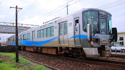 ![]() 発車した521系AK07編成富山行き(にわか雨) |