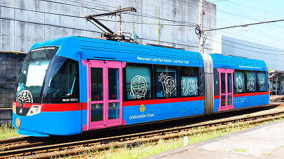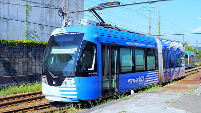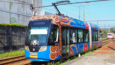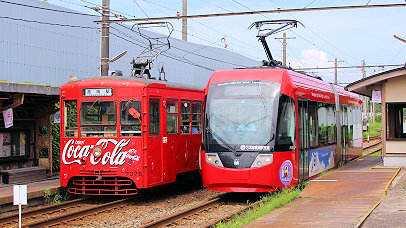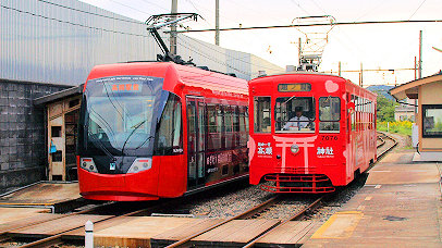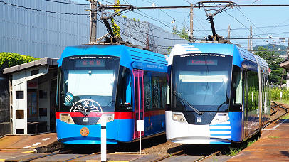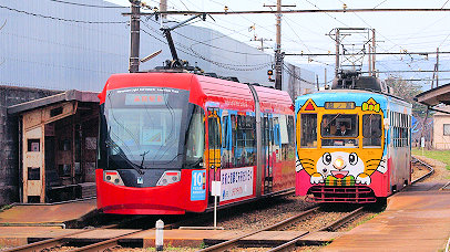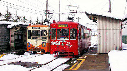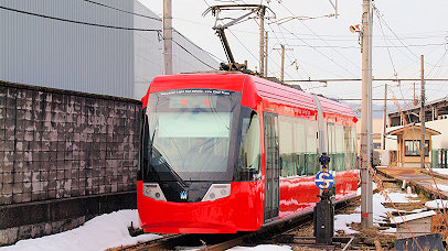 ![]() 発車したMLRV1005高岡行きと停車中のMLRV1001越ノ潟行き |