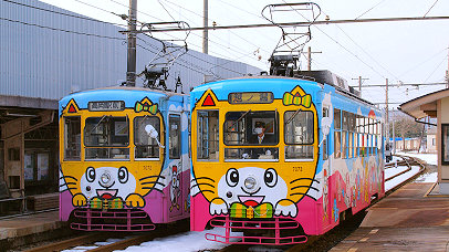 ここはJR新湊線の新湊駅があったことから、JR新湊線の旅客扱い 廃止後も新湊という駅名だったが、ここは新湊市の西の外れで名前がふ さわしくないので現在の六渡寺という名前に改名された。早朝、夜間を 除き、ほとんどの電車がここで行き違いする。立川志の輔さんの案内で は行き違いのことをスリカエと言っている。 万葉線も射水線時代はタブレット交換で列車が行き違うことを交換と 言うが、現在はタブレットの交換風景も見られなくなり、行き違いと言 う場合が多くなっている。 この駅の信号方式は越ノ潟行きの電車は六渡寺駅に先着して停車して から高岡駅行きが駅へ進入できる方式だったが、電車が遅れた場合長時 間遮断機が下りた状態になり、長らく庄川堤防上の国道415号線を走 るドライバーから不評をかっていたが2002年12月16日から同時 に進入できる方式に改善され踏切の遮断時間は短くなった。また、電車 が庄川橋梁上で信号待ちをする姿も見られなくなった。 2010年に万葉歌パネルが新調され待合室の壁に張り付けとなり、 ホームに六渡寺周辺観光案内パネルも設置された。 2020年5月1日からネーミングライツで、牧田組本社 六渡寺と なっている。 |
