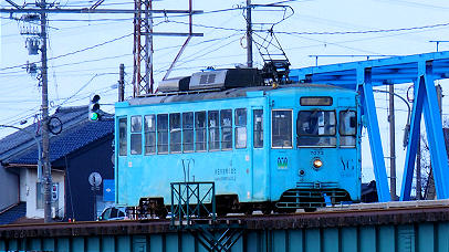 ![]() 庄川左岸から庄川橋梁を渡るMLRV1003と立山連峰 |