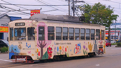 | ここには万葉線の車両基地があり、本社、車庫、運転指令所と乗務員 区が入る運転部軌道課があり、ここで運転手が交代する。万葉線の1乗 務は米島口→高岡駅→越ノ潟 or 中新湊 → 米島口の1時間20分ないし 1時間30分の乗務らしい。2010年12月1日万葉線本社は社員の 意思疎通を図り連帯感を強くするため、電停前の建屋から運輸部軌道課 の建屋に移転した。入口にあった「万葉線 運輸部軌道課」の銘板が取 り外され「万葉線株式会社」に代わっている。 電停名は伏木港線(1971年廃線)に米島電停があったため、米島口 となっている。現在も米島電停のあった場所に加越能バスの米島バス停 がある。アルビス米島店は米島にあるが、万葉線の本社・車庫は荻布に ある。 車両基地では毎年6月10日の路面電車の日と10月14日の鉄道の 日に路面電車まつりが開催される。同記念日が平日の場合は前後の休日 (土曜日)に開催される。 ここから新湊方面へは右へ曲がって専用線を走り、JR氷見線、JR 新湊貨物線を一気に跨いで、能町口から吉久−中伏木の中間まで再び路 面区間を走る。専用線に入ってすぐ右側に万葉線米島変電所がある。 新湊方面から米島口に電車が到着すると県道の高岡方向の信号が赤に なり電車はノンストップで専用軌道から併用軌道に入る。高岡駅側に車 両基地から本線への渡り線があり日中も車両交換などで車両基地への出 入りがある。現在入庫は新湊方面から来た電車が米島口止まりとなり、 乗客を降ろした後、渡り線分岐点の先まで進み、そこで進行方向を変え て入庫する。 |
